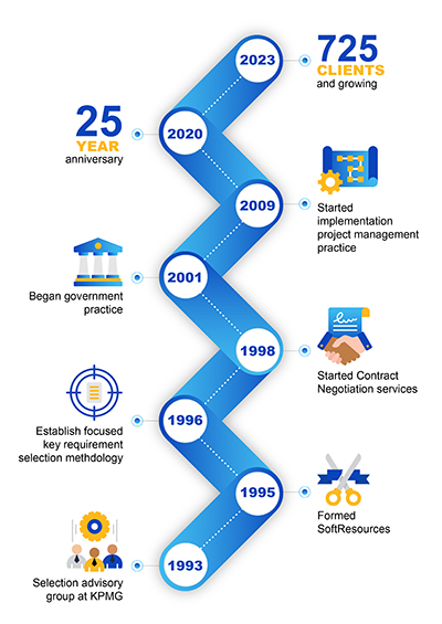 Our experienced team members define us at SoftResources. Each individual brings years of expertise consulting clients in assessing software and processes, evaluation, selection, and project implementation. We dedicate our time to providing the best quality consulting services. Our efforts are reflected in the confidence of our clients, many of which have requested our services for multiple projects.